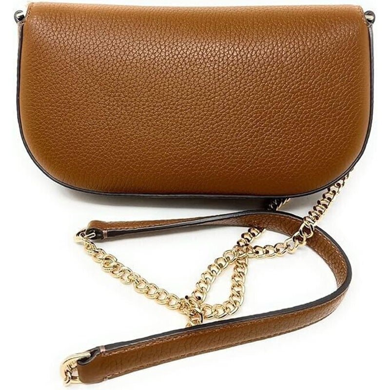 • تتميز شنطة يد بخامة جلد مرصوف بالحصى باللون البني مع تفاصيل معدنية ذهبية.
